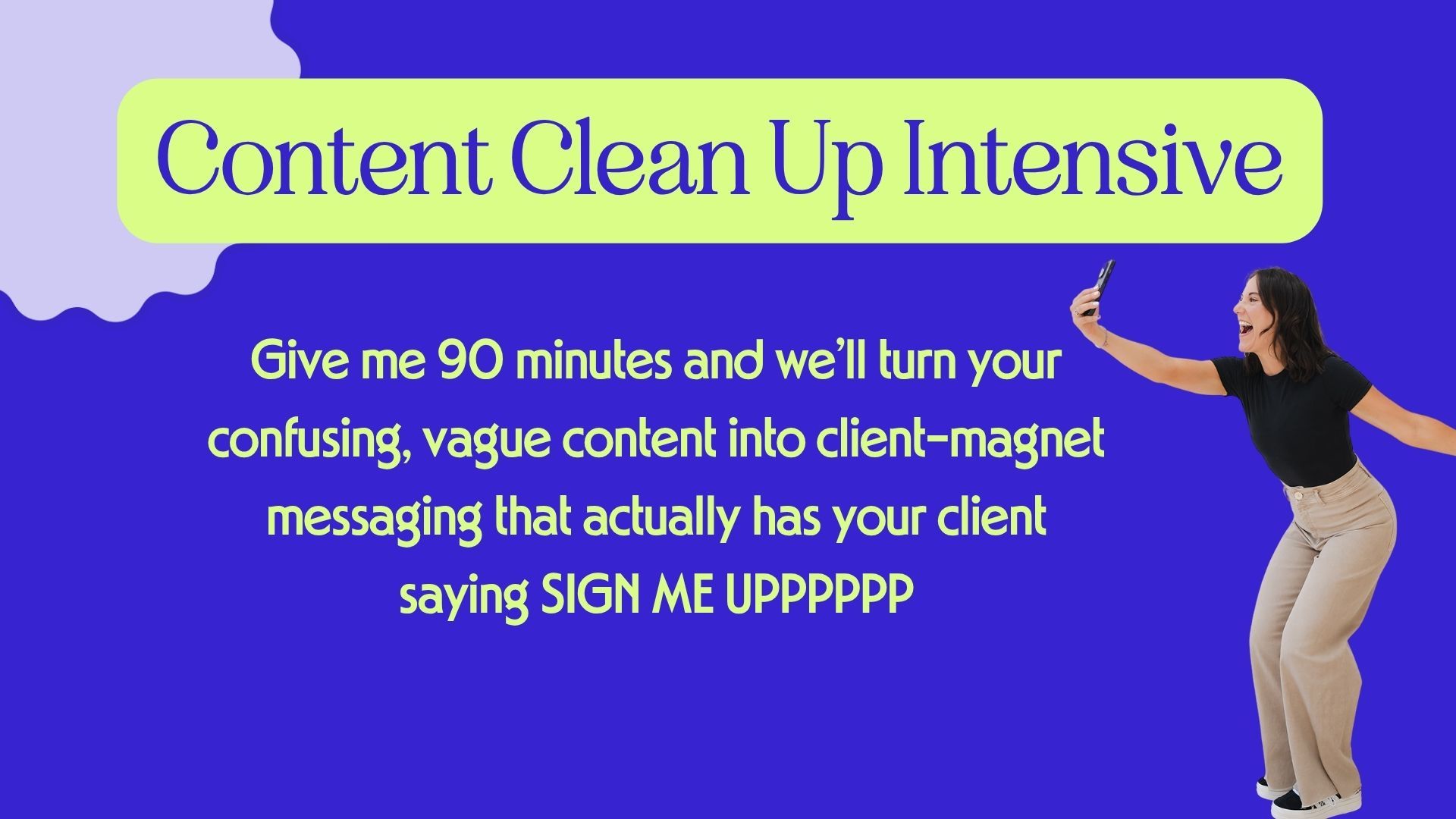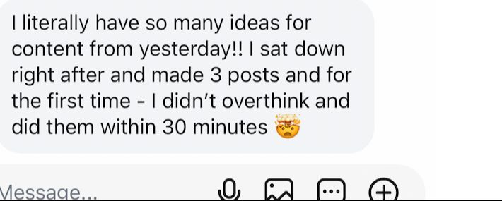 A focused 90-minute messaging session for coaches who feel stuck in their own head and tired of creating content that's not converting. Walk out with clear messaging, stronger ideas, and content that finally sounds like you & converts followers to buyers.